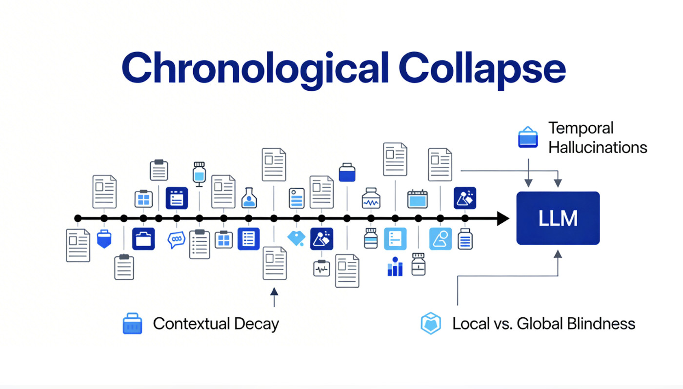 Traditional LLMs are remarkable at text, but they fail the “Time Test” in healthcare. When signals are spread across a decade of notes, current models suffer from:
