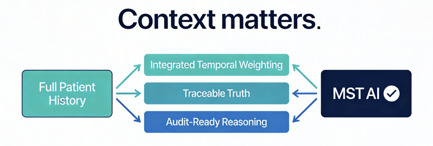 Traditional LLMs flatten years of care into a single moment. MST’s AI preserves the full longitudinal journey — signal intact.